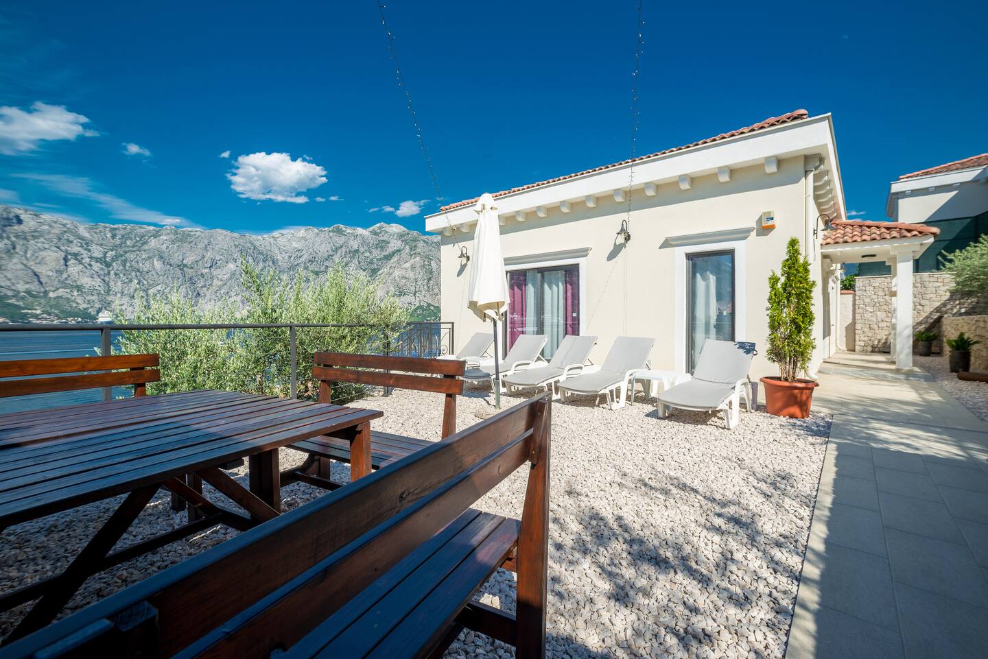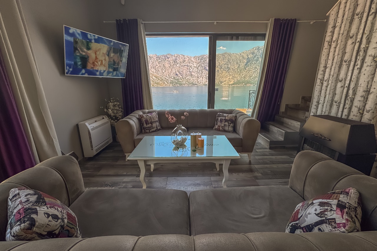 Also on the ground floor are two elegantly furnished bedrooms with queen-size beds and a shared bathroom, including a master bedroom with direct sea views.